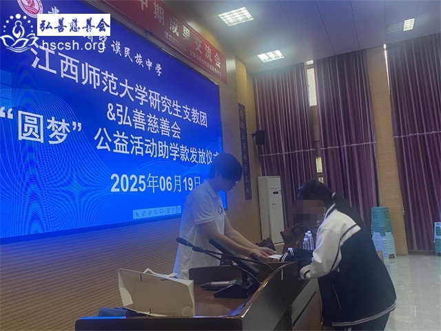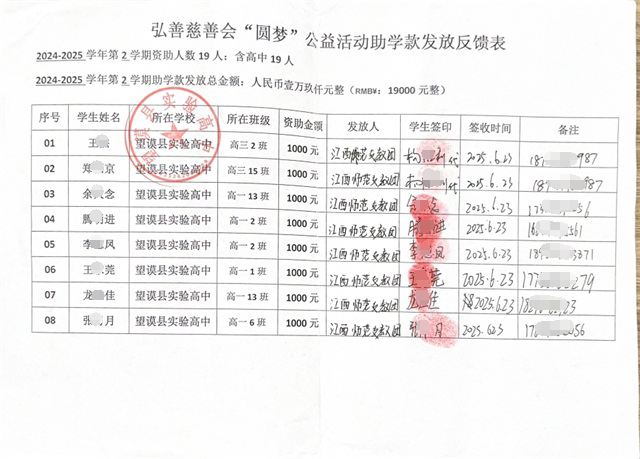 本学期,弘善慈善会共资助贫困生19名(均为高中生)。发放助学金19000元,本次助学金由江西师范大学支教老师代为发放,老师们亲手将善款交到学生手中,并鼓励他们珍惜学习机会,努力掌握知识,未来以能力回馈社会。